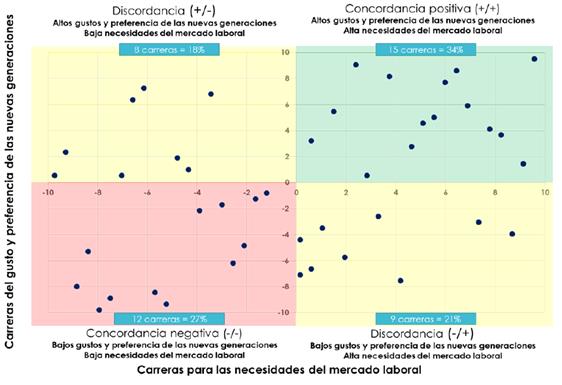 A partir de la medición del gusto y preferencia de 44 carreras universitarias por parte de las nuevas generaciones y con la medición del grado de necesidad de las mismas por parte del mercado laboral se realizó el análisis de concordancia-discordancia.