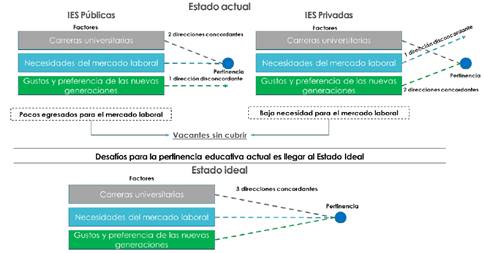 El análisis de los datos identifica un estado actual y un estado ideal de la concordancia entre tres factores de la pertinencia educativa; que es distinto para las IES según su financiamiento.
