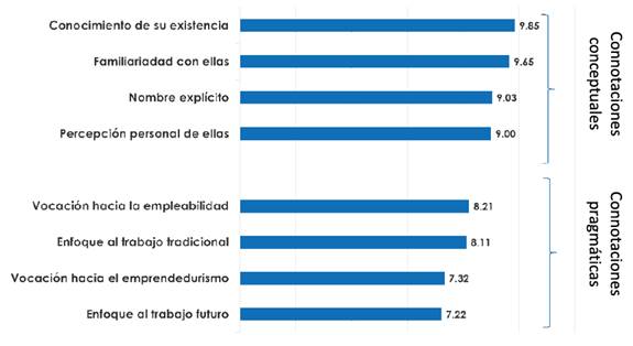 Entonces, los centennials asignan notas valorativas entre 9.00 y 9.85 a cuatro de ocho criterios determinantes de la conformación del set de carreras universitarias elegibles, explorados (gráfica 1). De ella se infieren dos partes agrupadas según las medias ponderadas que guardan relación por referencia a un concepto superior. Las notas altas apuntan a la connotación conceptual de las carreras y las notas menores de 9.00 refieren a aspectos pragmáticos de las mismas.