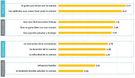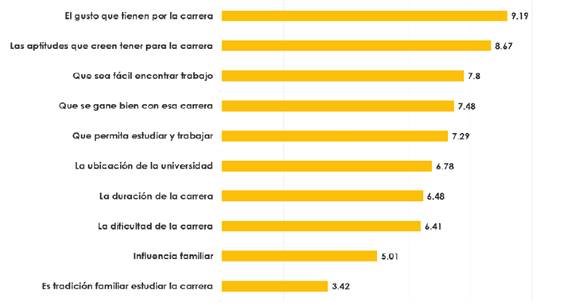 A continuación se presentan 10 factores que los informantes dicen considerar al elegir la carrera profesional que estudiarán. Para identificar con facilidad se presenta un orden descendente.