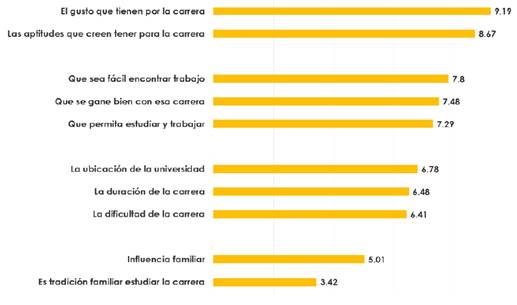 De la gráfica 2 se concluye que el gusto por la carrera (cuestión emocional), es el factor con mayor peso (9.19) entre las nuevas generaciones para elegir su carrera universitaria. Sin embargo, los factores relacionados con la familia son valorados con puntajes más bajos (3.42, y 5.01). Además, un análisis de las valoraciones permite identificar un agrupamiento temático por proximidad de las medias ponderadas calculadas.