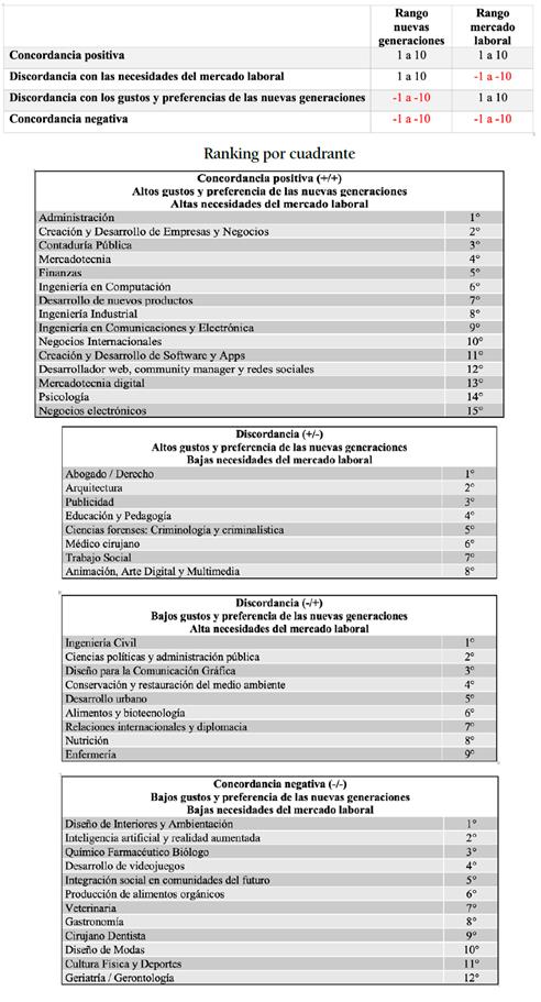 La clasificación en cada uno de los cuatro ejes está conformada por la combinación de gustos y preferencias por parte de las nuevas generaciones con el grado de necesidad expuesto por parte del mercado laboral.