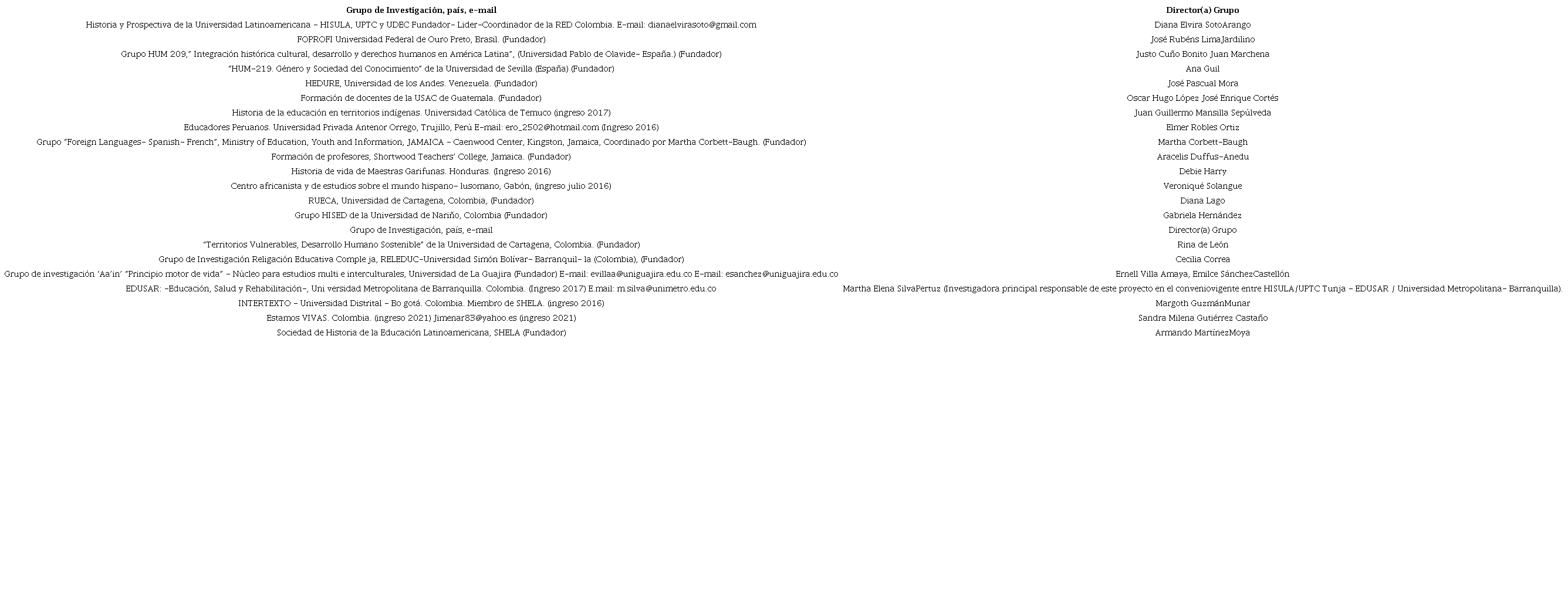 Quinto. Presenta actualmente los siguientes grupos de investigación con sus respectivos coordinadores, Grupo de investigación Historia y Prospectiva de la Universidad Latinoamericana -HISULA, UPTC y UDEC, coordinadora Dra. Diana Elvira Soto Arango, Grupo FOPROFI Universidad Federal de Ouro Preto, Brasil, coordinador José Rubens Lima Jardilino; Grupo HUM 209,” Integración histórica cultural, desarrollo y derechos humanos en América Latina”, (Universidad Pablo de Olavide - España.), coordinador Justo Cuño Bonito y Juan Marchena; Grupo “HUM-219. Género y Sociedad del Conocimiento” de la Universidad de Sevilla (España), coordinadora Ana Guil; Grupo HEDURE, Universidad de los Andes. Venezuela, Coordinador José Pascual Mora; Grupo “Formación de docentes” EFPM de la USAC de Guatemala, Coordinado por Oscar Hugo López y José Cortés; Grupo de investigación Historia de la Educación en territorios indígenas, Universidad Católica de Temuco, Chile, Dr. Juan Guillermo Mansilla Sepúlveda. Grupo “Foreign Languages- Spanish- French”, Ministry of Education, Youth and Information, JAMAICA - Caenwood Center, Kingston, Jamaica, Coordinado por Martha Corbett-Baugh; Grupo Formación de profesores, Shortwood Teachers’ College, Jamaica, coordinadora Aracelis Anedu; Gupo Centro africanista y de estudios sobre el mundo hispano-lusomano, Gabón, Dra. Veroniqué Solangue; Grupo RUECA, Universidad de Cartagena, Colombia, Dra. Diana Lago; Grupo “Territorios Vulnerables, Desarrollo Humano Sostenible” de la Universidad de Cartagena, Dra. Rina de León; Grupo HISED de la Universidad de Nariño, Dra. Gabriela Hernández. Grupo de Investigación Religación Educativa Compleja, RELEDUC- Universidad Simón Bolívar-Barranquilla (Colombia), Dra. Cecilia Correa; Grupo de investigación “Historia Educación y Desarrollo”, de la Universidad de Nariño; Grupo ‘Aa’in’ “Principio motor de vida” - Núcleo para estudios multi e interculturales, Universidad de la Guajira, coordinador Ernell Villa Amaya; Sociedad de Historia de la Educación Latinoamericana, SHELA, bajo la presidencia del Dr. Armando Martínez Moya.
