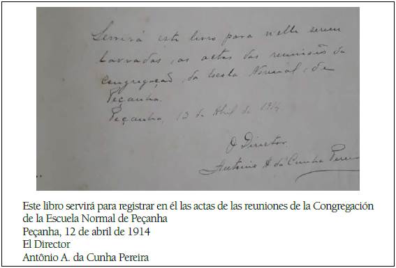 En la primera reunión realizada por la citada congregación se eligió al Dr. Antônio da Cunha Pereira como director y a Florestano Flores como vicedirector, quienes asumieron sus cargos el 13 de abril de 1914 y en su momento trataron la aprobación del estatuto y del cuadro de profesores del establecimiento educativo. En la figura 5, presentamos la copia (con su transcripción al español) de la primera página del libro de actas en el que se consignaban las reuniones realizadas en la institución.