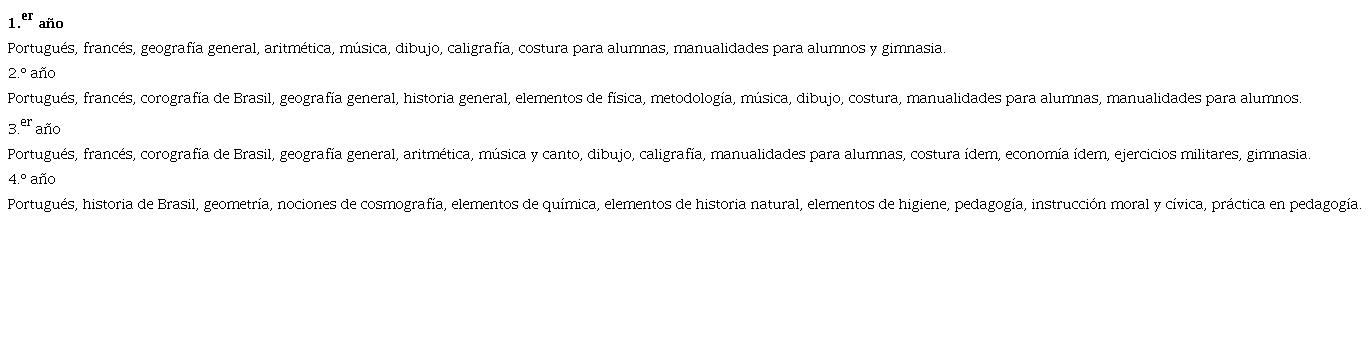 En cuanto al reglamento aprobado, que trataba de la organización curricular de los años del curso, las materias prescritas eran Portugués, Francés, Aritmética, Geografía general y Corografía de Brasil, nociones de Cosmografía, Historia general, Historia de Brasil, elementos de Física, Química, Historia Natural e higiene; Pedagogía, Deberes morales, Derecho, Derechos y deberes del ciudadano (instrucción moral y cívica), Música y canto, Dibujo y caligrafía, Economía doméstica, Gimnasia y ejercicios militares para los alumnos. Estas asignaturas eran distribuidas como se muestra en la tabla 1.
