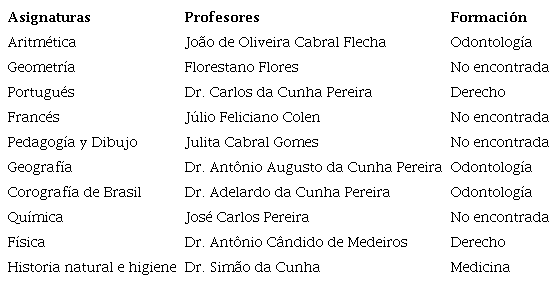 En el primer año de funcionamiento de la Escuela Normal de Peçanha, en 1914, los profesores fueron designados el 13 de abril de ese mismo año según el Acta de la Primera Reunión de la Congregación. Entre los cargos aprobados se establecieron aritmética, geometría, portugués, francés, pedagogía y dibujo, geografía, historia general y de Brasil, corografía de Brasil, química, historia natural, higiene y física. En consecuencia, la misma acta cita que los demás profesores serían asignados en otro momento. Sin embargo, se puede observar que, entre las asignaturas establecidas, de acuerdo con la tabla 1, existe un desajuste entre física y química del primer año dictadas en la Escuela Normal de Peçanha.