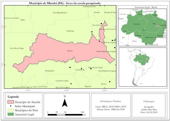 Es necesario ubicar geográficamente la investigación y explicar de forma breve algunos temas relacionados con la enseñanza básica secundaria en Brasil, a públicos no nativos. Desde el punto de vista de la extensión territorial, la amazonia brasileña es más grande que muchos países. Según el Instituto Brasileiro de Geografia e Estatística (IBGE), la amazonia brasileña "tiene un área aproximada de 5.217.423 km2, que corresponde a aproximadamente el 61 % del territorio brasileño"3. Esta investigación se enfoca en estudiantes de una escuela pública ubicada en la provincia de Pará, una de las siete que forman la llamada amazonia brasileña. En el mapa 1 se puede ubicar la ciudad en la que se realizó la investigación.