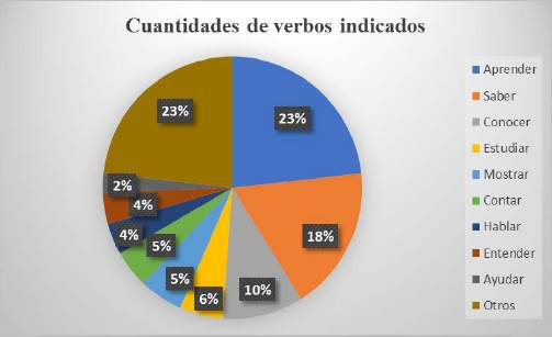 Para continuar con la contabilidad, utilicé la herramienta de identificación de palabras de Word después de transcribir todas las respuestas de los cuestionarios. Es importante señalar que los estudiantes indicaron los verbos catalogados. La pregunta estaba abierta y no había ninguna indicación para que los estudiantes eligieran uno u otro verbo. En otras palabras, es un conjunto de expresiones del léxico gramatical de los estudiantes.