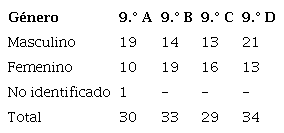 Antes de centrarnos en los registros elaborados y catalogados de las respuestas, es oportuno mostrar la composición de los alumnos y alumnas que participaron en la actividad. Como ya se indicó, para este artículo movilizamos un cuestionario respondido por 126 alumnos del 9.° grado de secundaria. La tabla 1 muestra la distribución de estudiantes por grado y género.