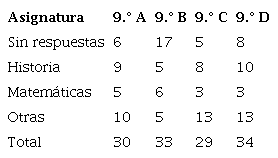 Lo que primero nos llama la atención es la gran cantidad de estudiantes que no respondieron la pregunta. Por ese motivo tuve que crear la categoría "sin respuestas". Esta categoría fue la más presente en la clase de 9.° grado B: 17 de 33, es decir, más de la mitad de los estudiantes no respondieron (seis estudiantes del grado 9.° A, cinco del grado 9.° C y ocho del 9.° D).