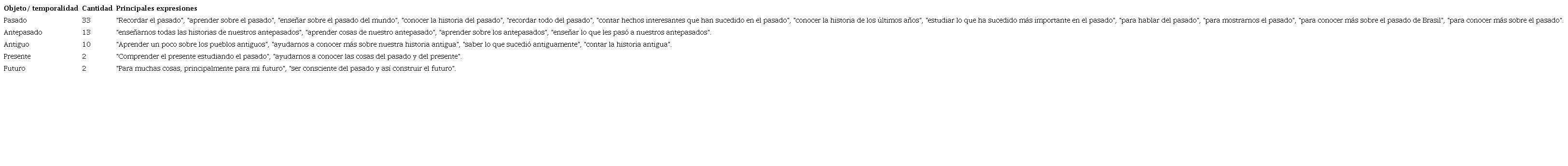A diferencia de la variedad de verbos utilizados, los estudiantes comprenden que la historia en la escuela sirve, predominantemente, para aprender/conocer/estudiar el pasado. El pasado es el objeto identificado, en la mayoría de las respuestas, como el principal tema de interés. Simultáneamente, el pasado es el tiempo con el que los estudiantes, en general, relacionan la historia. Este resultado es similar al señalado en las investigaciones de Fuentes Moreno cuando enfatiza que "[...] mayoritariamente, los alumnos analizados asocian la Historia con el conocimiento del pasado"26.