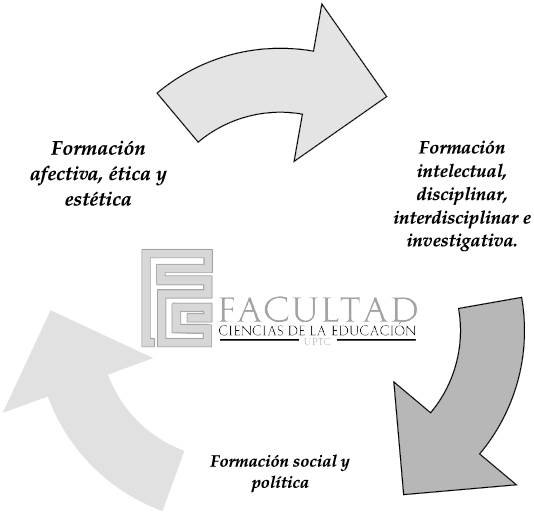 El centro de las reflexiones pedagógicas gira en muchos de los casos en torno a su objetivo que se puede definir como la formación del hombre y de la mujer en sus diversos contextos sociales, culturales, de saber y conocimiento y de vida. Esta comprobación hace que la pedagogía se organice desde el punto de vista teórico a partir de los diversos discursos y apuestas que la sociedad y los sistemas de pensamiento han realizado en torno a la formación de sus miembros. En este caso el concepto y la función de la formación se desplazan y se resignifican. La formación, para la Facultad de Ciencias de la Educación, es comprendida como ese sistema de herramientas conceptuales y prácticas que permiten a un licenciado o profesional de la educación formarse cómo universitario y profesional y poder ejercer un oficio, un arte, una actividad que consiste en permitir o propiciar la formación de los otros como mediador de los saberes y conocimientos construidos históricamente como patrimonio de humanidad y de los procesos culturales. Ante esta situación la formación de docentes EC se presenta como un ejercicio que permite al estudiante de licenciatura constituirse en tres planos-dimensiones diferenciados pero interrelacionados de formación: