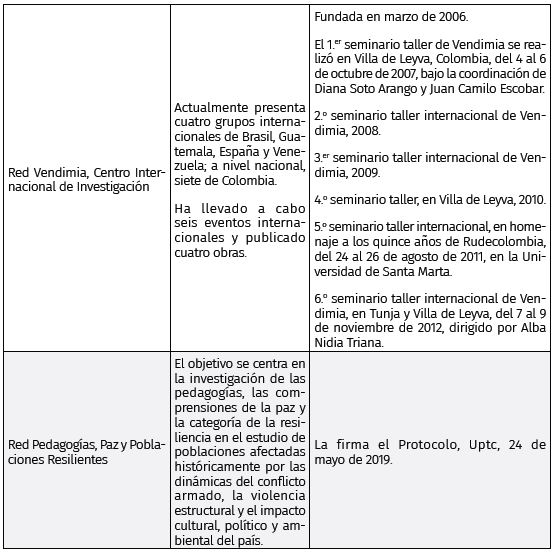 Se realizaron trabajos conjuntos (grupos e instituciones) para el análisis de las pedago gías emergentes, la paz decolonial y las poblaciones resilientes/vulnerables, para mejorar la calidad de vida del sector de la población que ha sido víctima de los conflictos político-sociales. Pero también para sensibilizar a la población sobre un tema especialmente neurálgico que atañe a la nación colombiana y es marco supranacional34.