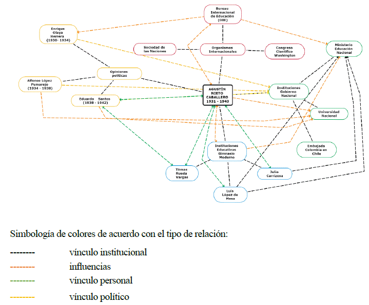 En cuanto al segundo caso, a partir de la documentación analizada fue identificada la red académica y política en torno de la práctica de Agustín Nieto Caballero, en el periodo de 1914-1943. La comunidad de práctica, representada en forma de red académica, refleja sus vínculos con organismos internacionales e instituciones gubernamentales, así como su rol protagónico. Este aspecto no ha sido considerado adecuadamente por los trabajos historiográficos sobre su vida y obra. La dimensión internacional de su práctica como reformador pedagógico, diplomático y político tuvo un impacto crucial en la articulación de los discursos reformistas con los esfuerzos de constituir al magisterio colombiano y al sistema educativo en dos actores claves para la modernización del país. Al mismo tiempo, su participación en redes internacionales de amplio alcance es un factor poco estudiado, pero claramente decisivo en la historia de la Universidad Nacional de Colombia y el campo intelectual colombiano.