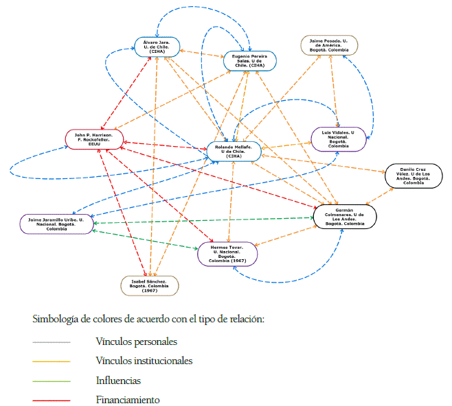 El filósofo Danilo Cruz Vélez, decano en la Universidad de los Andes de Bogotá, solicitó a Rolando Mellafe, en 1966, la pasantía de postgrado en investigación, realizada por el historiador Germán Colmenares en el Centro, durante 196767. El mismo año se registra la presencia de la historiadora Isabel Sánchez y del historiador Hermes Tovar. También en 1967, el historiador Jaime Jaramillo Uribe fue invitado al seminario sobre esclavitud negra, organizado por el Centro con financiamiento de la Comisión Fulbright68. El paso de estos historiadores colombianos por el CIHA de la Universidad de Chile es uno de los puntos más relevantes de los vínculos expresados en el esquema de red, y el único que ha sido abordado recientemente69. La importancia del vínculo intelectual y académico se expresa en que estos historiadores colombianos tomaron parte en la formación del movimiento intelectual denominado Nueva Historia en Colombia, ejemplo de iniciativas de renovación de los estudios históricos.