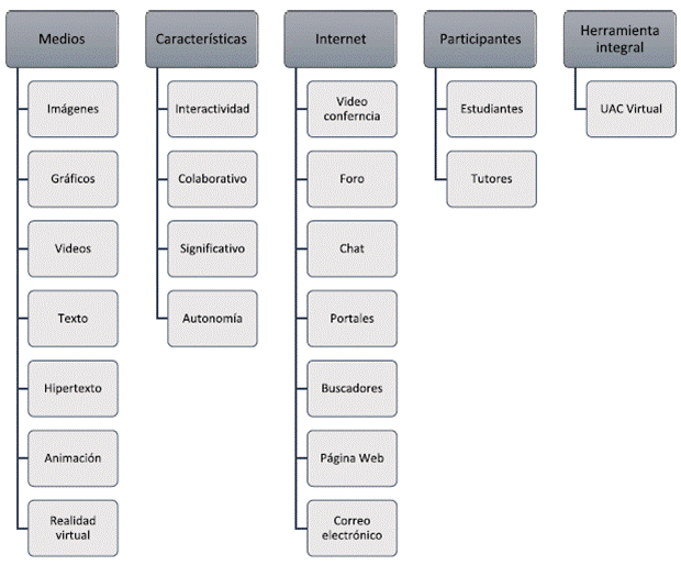 El tutor puede, además de entregar información en diversos formatos y maneras, ofrecer múltiples y variadas actividades para que el estudiante cree sus propios esquemas mentales, vinculándolos con los saberes previos y sus experiencias. Son numerosos los recursos exis tentes para el aprendizaje en la web, si bien es posible diseñar otros con niveles crecientes de profundidad (aprendizaje adaptativo). El exponer los contenidos como organizadores visuales facilita la navegación y revisión de los recursos, ofreciendo una síntesis informativa preliminar del desarrollo de las sesiones de aprendizaje, productores parciales, productos integradores e interacción. Las estrategias didácticas para educación virtual fueron dadas a partir de actividades colaborativas, intercambio de experiencias y asesoría virtual como parte del acompañamiento en la secuencia formativa.