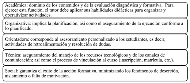 Julio Cabero34 propone cinco funciones que requieren de una serie de actividades que le permiten al tutor convertirse en facilitador del proceso de aprendizaje en línea, como se expone en la tabla 3.