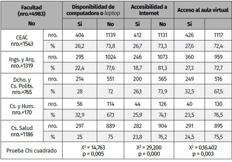 En el estudio, implementado por la Dirección de Desarrollo Académico, se encontró que, en las mencionadas facultades, de modo general, la mayoría de los estudiantes no tiene necesidades tecnológicas que imposibiliten sus estudios universitarios; sin embargo, se hace un análisis de algunos criterios que de algún modo afectan la enseñanza-aprendizaje en algunos estudiantes de la universidad. La mayor proporción de estudiantes de la Facultad de Ciencias y Humanidades no disponen de computadora o laptop (32,9 %); con respecto a internet, la mayor proporción de estudiantes de la facultad del CEAC no tiene acceso a la red (26,7 %); en cuanto al acceso al aula virtual, la mayor proporción de estudiantes de la Facultad de Derecho y Ciencias Políticas presenta dificultades de acceso (32,5 %). De acuerdo con los criterios de análisis se encontraron diferencias estadísticamente significativas con respecto a las necesidades tecnológicas de los estudiantes dependiendo de la facultad de procedencia (p < 0,05) (tabla 4).