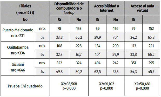 El panorama con respecto a las necesidades tecnológicas en la UAC es algo diferente a la sede central, debido a que existen mayores limitaciones que en ocasiones imposibilitan los estudios universitarios. Realizando un análisis de los criterios que de algún modo afectan la enseñanza-aprendizaje, se puede apreciar que en la filial de Sicuani, el 49,8 % de los estudiantes no dispone de computadora o laptop, la accesibilidad a Internet presenta una mayor limitación que la filial de Quillabamba, según lo manifestado por el 40,1 % de los estudiantes, y en cuanto al acceso al aula virtual, el 54,3 % de los estudiantes de Sicuani presenta dificultades. De acuerdo con los criterios de análisis, para cada filial se hallaron diferencias estadísticamente significativas sobre las necesidades tecnológicas de los estudiantes. (p < 0.05) (tabla 5).