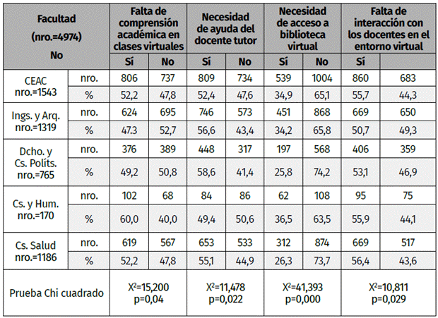 En lo que se refiere a las necesidades académicas, en la sede central de la universidad los estudiantes enfrentan ciertas limitaciones académicas que obstruyen su normal aprendizaje. La mayor proporción de estudiantes de la Facultad de Ingeniería y Arquitectura, el 52,7 %, manifiesta que les cuesta entender las explicaciones durante las clases virtuales; el 50,6 % de los estudiantes de la Facultad de Ciencias y Humanidades busca ayuda o acompañamiento de un docente tutor cuando tiene dificultades en sus asignaturas; el 74,2 % de los estudiantes de la Facultad de Derecho y Ciencias Políticas tiene la necesidad de acceder a bibliotecas virtuales para el desarrollo de sus actividades académicas y al 49,3 % de los estudiantes de Ingeniería y Arquitectura le cuesta interactuar con sus docentes durante el desarrollo de las actividades académicas virtuales. De acuerdo con la facultad de procedencia, y aplicados los criterios de análisis, se encontraron diferencias estadísticamente significativas con respecto a las necesidades académicas de los estudiantes (p < 0.05) (tabla 6).