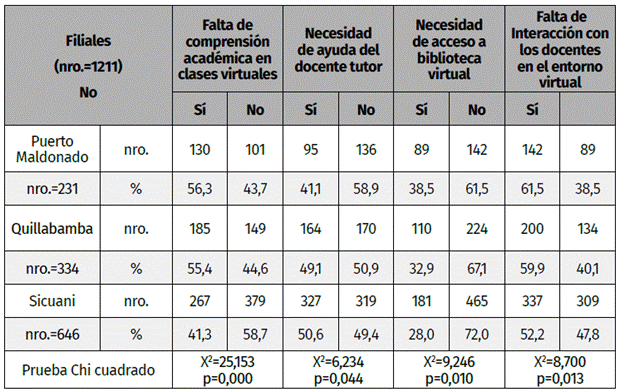 Las necesidades académicas en las filiales de la UAC son similares a las de la sede central; la mayor proporción de estudiantes de la filial de Sicuani, el 58,7 %, manifiesta la dificultad de entender las explicaciones durante las clases virtuales; el 58,9 % de los estudiantes de la filial de Puerto Maldonado busca ayuda o acompañamiento de un docente tutor cuando tiene dificultades en sus asignaturas; el 72 % de los estudiantes de la filial de Sicuani tiene la necesidad de acceder a bibliotecas virtuales para el desarrollo de sus actividades académicas y al 47,8 % de la filial Sicuani le cuesta interactuar con sus docentes durante el desarrollo de las actividades académicas virtuales. De acuerdo con los criterios de análisis, se encontraron diferencias estadísticamente significativas con respecto a las necesidades académicas de los estudiantes, de acuerdo con la filial de procedencia (p < 0.05). (tabla 7).