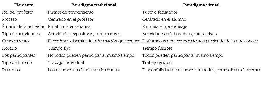La tabla 1 muestra las diferencias entre los paradigmas de la educación tradicional y la educación virtual.