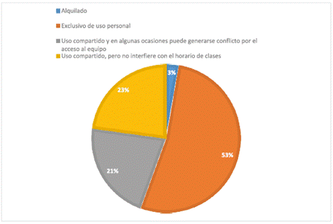 Frente a este tema, de los estudiantes que respondieron la encuesta apenas un 53 % afirmaba tener un equipo de uso exclusivo para su formación universitaria, cifra bastante desalentadora frente a las exigencias del modelo ERE. Si a este porcentaje le sumamos el 23 % que refiere acceso a un equipo de uso compartido, pero que no interfería con el horario de clases, solamente alcanzaría un 76 %; lo que nos permite concluir que casi una cuarta parte de los estudiantes tenía dificultades permanentes para acceder a un equipo electrónico de conexión.