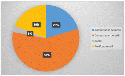 Pero las dificultades de conexión se hacen más palpables al examinar el tipo de equipo utilizado para “asistir” a clases. Así, encontramos que un 58 % se conectaba mediante computador portátil, 20 % en computador de escritorio, 19 % en teléfono móvil y 3 % en tableta electrónica (tablet). Es decir, un 22 % de estudiantes no contaba con un equipo adecuado para desarrollar sus actividades académicas, si tenemos en cuenta que las tabletas requieren dispositivos externos que brinden soporte ergonómico para trabajo prolongado y los teléfonos móviles no están diseñados con este fin, por lo que su uso representa mayor riesgo de desórdenes musculo-esqueléticos, cansancio visual y dificultades para acceder a programas especializados necesarios en la educación universitaria, entre otros28.