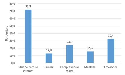 El 96% de los encuestados respondió que, para poder continuar con sus estudios de manera remota, incurrió en gastos en muebles, equipos o accesorios. El impacto de estos rubros en la economía familiar debe entenderse a la luz de dos datos adicionales: fueron gastos no planeados y se dieron en un contexto de contracción de ingresos. Al respecto, el 78 % de los estudiantes afirmaron que sus ingresos familiares (propios y de su núcleo familiar) disminuyeron con motivo de la pandemia.