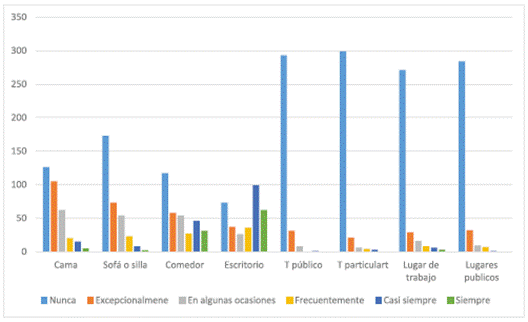 Lo primero que llama la atención radica en que no todos tomaban las clases en casa -como se esperaba con la medida de cierre de universidades-. Aunque el porcentaje es bajo (alrededor del 10 %) encontramos estudiantes que, excepcionalmente, se conectaban desde transporte público, transporte particular, lugar de trabajo o lugares públicos. La necesidad de desplazarse al sitio de trabajo y hacer diligencias personales o familiares se trató de compaginar con los estudios mediante la conexión en estos sitios. Alrededor del 8 % se conectaba en algunas ocasiones, frecuentemente o casi siempre desde el lugar de trabajo. Esta cifra evidencia las dificultades para tener tiempos diferenciados de trabajo y de estudio, y posiblemente este porcentaje sea mayor, dado que algunos de los estudiantes que asistían a clase desde transporte particular en realidad estaban trabajando como domiciliarios o conductores (como nos confirmaron algunos de ellos). Aunque sería necesario analizar más en profundidad la incidencia que pudo llegar a tener en su desempeño académico, son situaciones que no favorecen los procesos educativos y, a lo sumo, permitían “escuchar” la clase o cumplir con el requisito formal de asistencia.