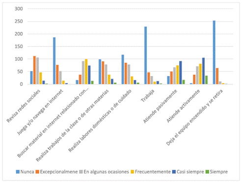 Esta es una situación compleja, puesto que la presencialidad en el aula no garantiza una participación de los estudiantes, como muy bien se sabe, y algunos de los distractores del mundo virtual (como el teléfono móvil) ya estaban en los salones antes de la pandemia. No obstante, las respuestas de los estudiantes a la pregunta abierta sobre lo que había sido más difícil de la nueva modalidad educativa, reiteradamente señalaban la facilidad con que se distraían o se deslizaban hacia otras actividades. Una queja común era que no sabían manejar el tiempo en la modalidad virtual, dificultad que no se origina en la metodología en sí misma, sino que es un problema general de la educación, porque pone en cuestión principios como la autonomía y la disciplina.