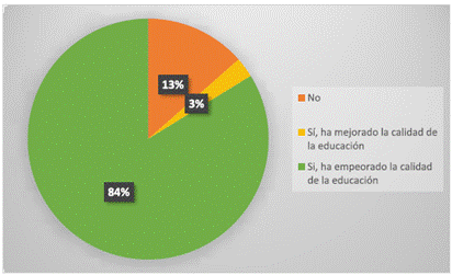 Los resultados presentados hasta este momento permiten entender por qué, a partir de ES su vivencia personal, el 84 % de los estudiantes aseveró que los cambios derivados de la pandemia afectaron negativamente la calidad de la educación y tan solo un 3 % creía que está había mejorado. En las respuestas abiertas argumentaban que con las videoclases estaban aprendiendo menos que antes (educación presencial tradicional), en cuanto a la adquisición de conocimientos teóricos y prácticos para su futuro desempeño profesional, situación que les generaba preocupación por las implicaciones que pudiera tener en el futuro.