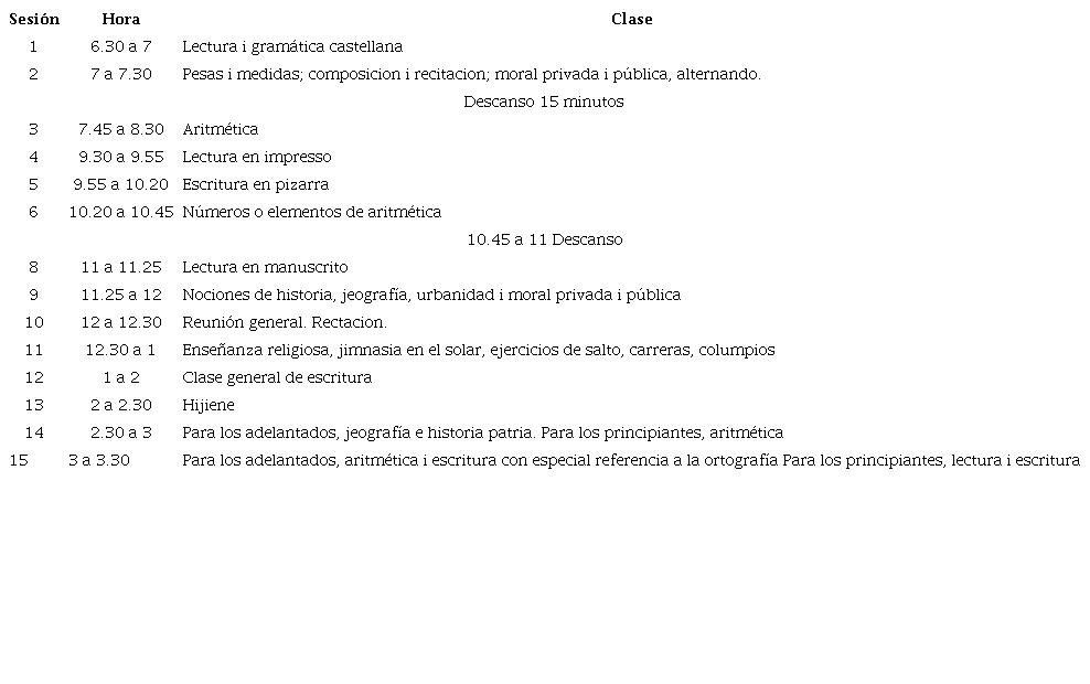 Mientras que para las escuelas de niñas se cambiaban los ejercicios de gimnasia por costura, bordados y otras actividades acordes al sexo; las sesiones 3 y 12 se alternaban un día de materia y “otro día de obras de aguja, economía doméstica i otros ejercicios que convengan a su sexo”91. Además, se recomendaba a los maestros que el estudiante explicara el significado de las frases con sus palabras, prestar atención a la comprensión de lo que leía, dictar una clase especial a los monitores para instruirlos en las materias y en sus deberes, y presentar informe de lo realizado en reunión programada para el segundo domingo de enero del año siguiente.