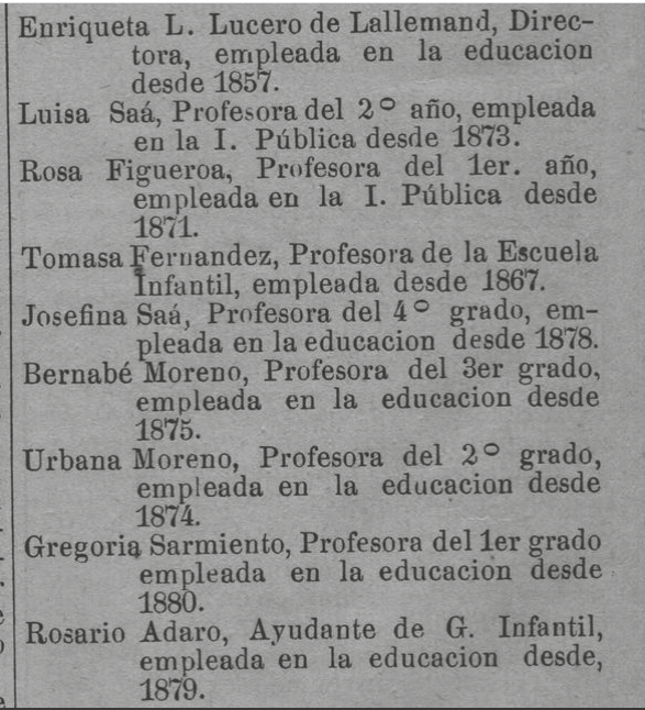 Las maestras que han venido aquí de los Estados-Unidos solicitadas por el Gobierno, aunque en cortísimo número, mostraban mayor capacidad de enseñar, superior á la de nuestros alumnos varones de las Escuelas Normales; pues, son en razón de su sexo, mas aptas para gobernar niños que los hombres. No es para escuelas de mujeres que se emplean las maestras mujeres, sino para la de hombres31.