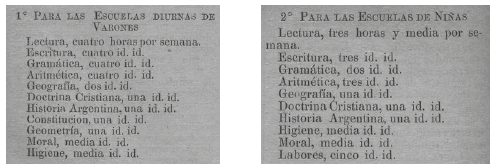 Así como sucedió en Colombia, la organización curricular en las escuelas de hombres y mujeres tenía diferencias en la distribución de los tiempos, en algunas asignaturas y en que para las mujeres se dedicaban cinco horas a labores, las cuales estaban determinadas para su desempeño en el hogar.