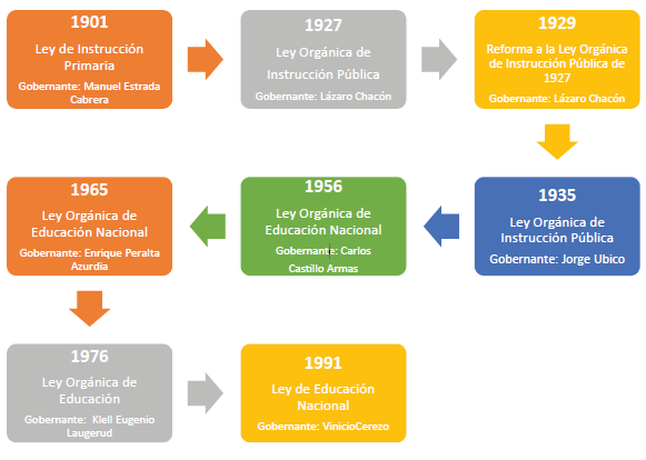 Entonces, como parte del recorrido vivido dentro del ámbito legal en materia educativa y que permitió dar los primeros pasos en el desarrollo de la educación infantil y, por ende, de la atención de los infantes de 0 a 6 años en Guatemala, las Leyes de Educación o Leyes Orgánicas de Educación que han formado parte de la historia en este ámbito, ofrecen información con respecto a cómo los gobiernos de turno concebían y prestaban atención a la educación de los habitantes más pequeños de Guatemala. En tal sentido, ahora se ofrecen elementos clave de las Leyes de Educación desde 1901, sobre todo, las que en su contenido incluyen la atención de los niños y niñas entre los 0 y los 6 años; pero, antes de exponer estos elementos, la siguiente figura muestra de forma cronológica las Leyes de Educación aprobadas y que entraron en vigencia durante el siglo XX. En este punto cabe mencionar que la Ley de Educación Nacional, que se encuentra vigente en el siglo XXI, fue emitida en el siglo anterior, específicamente en el año 1991.
