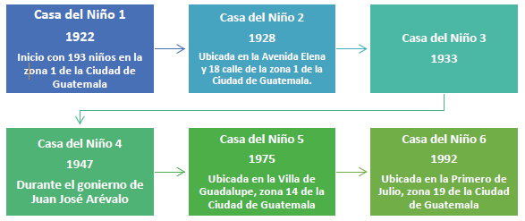 Además, en el año 1920, y después de la caída del gobierno de Manuel Estrada Cabrera, se funda el 29 de octubre de ese mismo año la Sociedad Protectora del Niño en Guatemala, cuya principal razón de ser fue la atención y el apoyo a madres que afrontaban situación de pobreza y pobreza extrema, así como a niños que habían quedado en el desamparo. Así, durante el siglo XX fueron fundadas seis casas del niño, las cuales fueron abiertas en diferentes momentos históricos y con características de gobierno diferentes. En ellas, los niños eran acogidos durante las jornadas de trabajo de sus madres. La siguiente figura muestra las casas del niño fundadas por número y año.