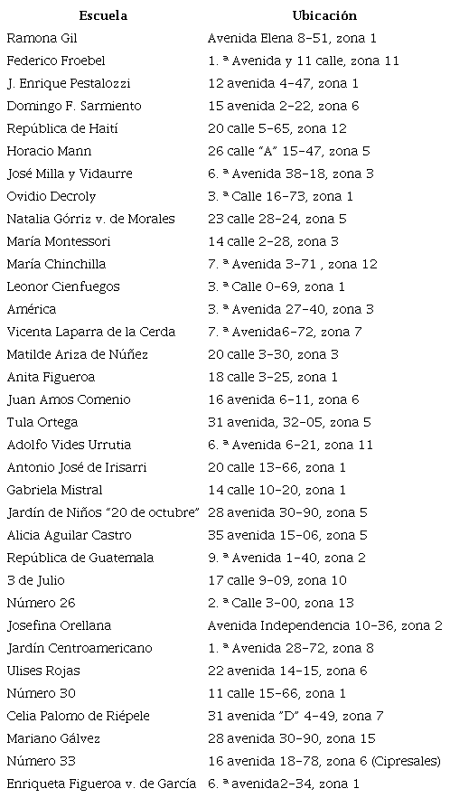 Es importante dar a conocer que las escuelas de párvulos y secciones anexas a escuelas primarias se encontraban ubicadas para 1967 especialmente en la Ciudad de Guatemala y en las cabeceras departamentales de los departamentos del país. Tenían una cobertura total de 13 587 niños y niñas en la capital y de 5248 en las cabeceras departamentales, para un total de 18 835 atendidos43. Las siguientes figuras presentan el nombre y la ubicación de los centros educativos parvularios existentes en 1967, los que serán clasificados por escuelas puras de párvulos o preprimaria de la ciudad capital y de las cabeceras departamentales, así como de secciones anexas a primarias.