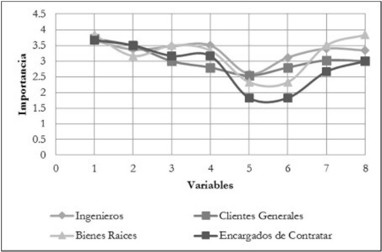 Dentro de la gráfica, se muestra que la media más baja pertenece al gremio de los clientes de bienes raíces, esto se debe a que las variaciones del presupuesto luego de ser firmado el contrato son responsabilidad del ingeniero o del cliente, sin embargo, el agente le da un grado de importancia ya que mientras exista una variación en el contrato puede tener una repercusión en un cliente insatisfecho que resulta en una mala publicidad para el mismo. El nivel de significancia en la prueba Anova es de 0.039, lo que significa que hay una diferencia significativa, es decir, los clientes bienes raíces difieren de todos los demás encuestados.