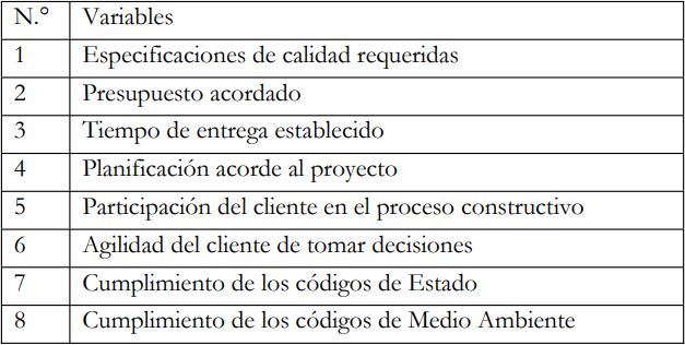 Se tendrán variables e indicadores para levantar información. Lo primero que se investigó fue la presencia: esta variable hace referencia a determinar si los factores planteados se encuentran dentro de las obras de edificaciones de la ciudad de Santo Domingo, es decir, si los mismos tienen aplicación dentro del campo de nuestra investigación. Luego se evalúa la importancia de cada factor, dicha variable indica entre los factores seleccionados cual influye más en el éxito de la construcción de edificaciones. Por último, se elaborará un ranking de factores con el objetivo de ordenar los mismos atendiendo al nivel de importancia impuesto por los encuestados.