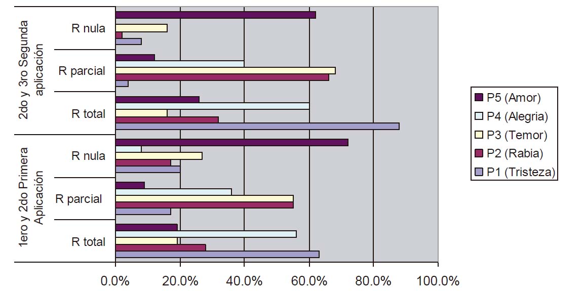 En este punto, afirmamos que el temor suple su disminución en la respuesta total con su aumento en la parcial, mientras con la tristeza ocurre lo inverso; es decir, que ambos sentimientos compensan en la segunda aplicación.