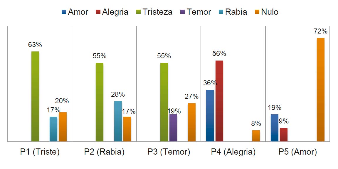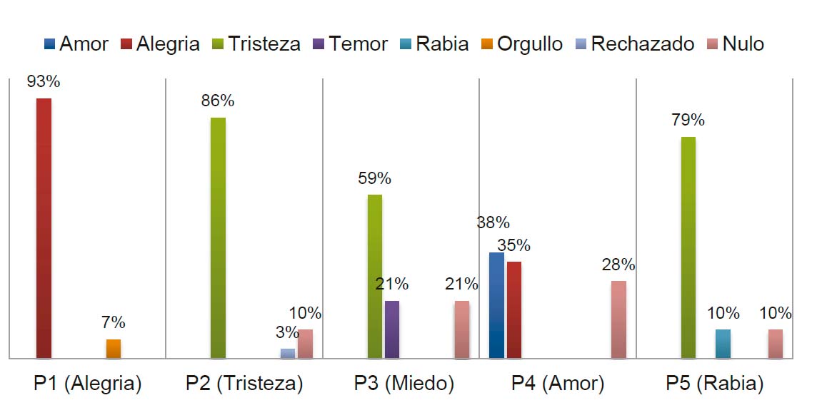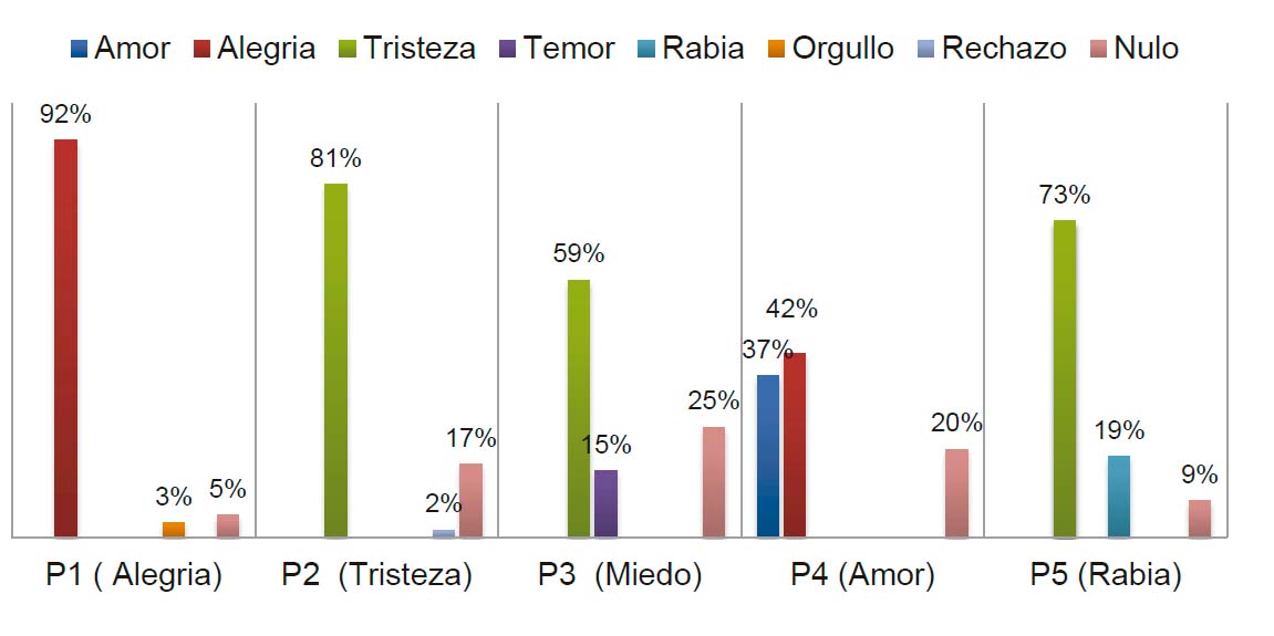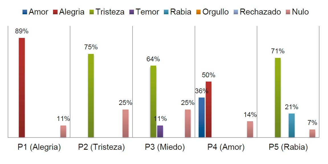 Las niñas de 1º y 2º grado de primaria presentan un comportamiento afectivo similar al descrito en la Figura 1, que corresponde a la totalidad de los y las participantes. Esto quiere decir que identifican la tristeza con un 57% en la P1, 62% en la P2 y 54% en la P3, aunque en estas dos últimas no es el sentimiento esperado.