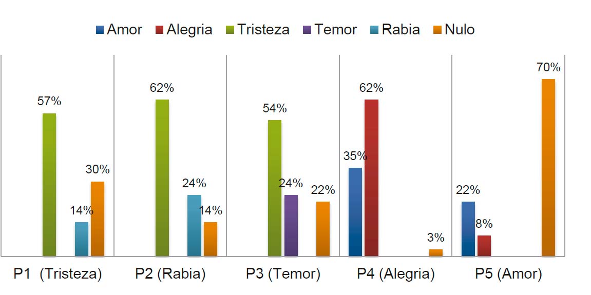 Si bien es verdad que el amor tuvo una manifestación leve, es decir, fue identificado con más precisión que en los grados anteriores, las respuestas nulas también fueron considerables. Al analizar la segunda medición, aumenta el reconocimiento de la alegría, aunque baja ligeramente la atribución apropiada al sentimiento de tristeza. Lo más destacable es la manera en que el sentimiento de rabia logra prácticamente triplicarse en las respuestas adecuadas de reconocimiento.