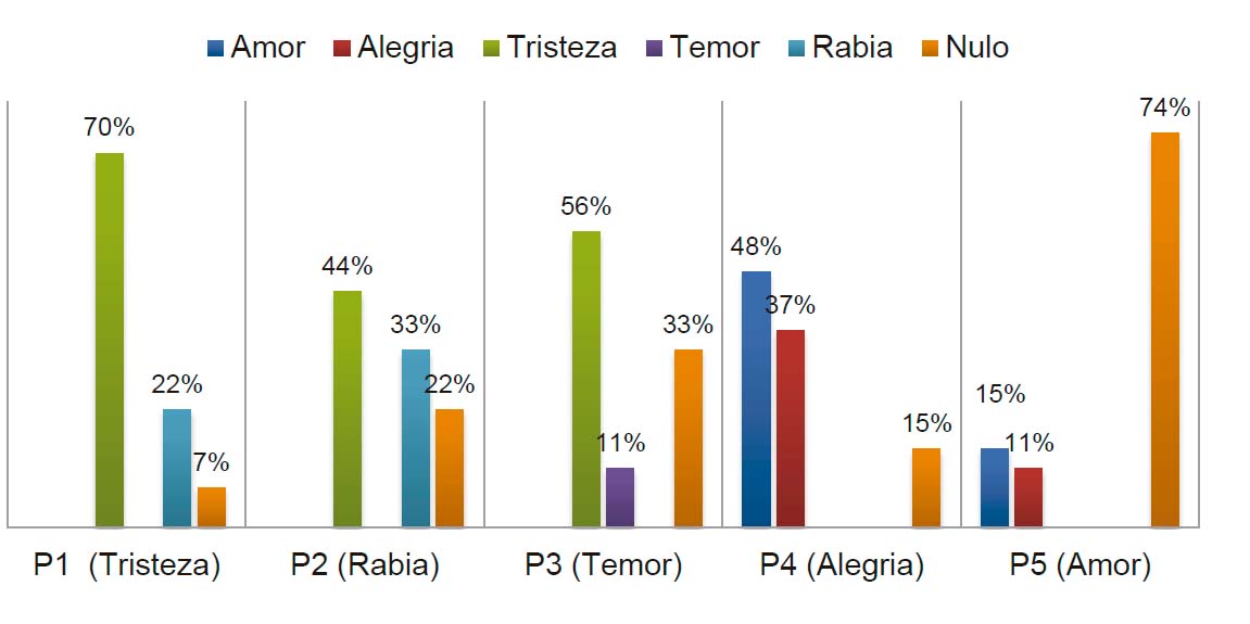 En lo relativo a las respuestas parciales, la segunda medición mostró aumentos en los siguientes sentimientos: miedo, de 59% a 63%; amor, de 43% a 50%; alegría, de 3% a 4%, y tristeza, de 2% a 8%. El sentimiento de rabia disminuyó de 73% a 54%.