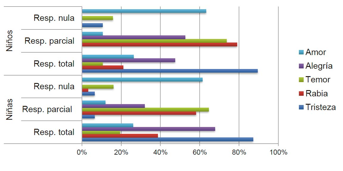 La respuesta parcial de mayor manifestación, tanto en los niños, con el 67%, como en las niñas, con un 58%, es el temor. A este sentimiento le sigue en importancia la rabia, con el mismo puntaje del 54% en los niños y las niñas. Para estas últimas, el amor se presenta con el mismo valor.