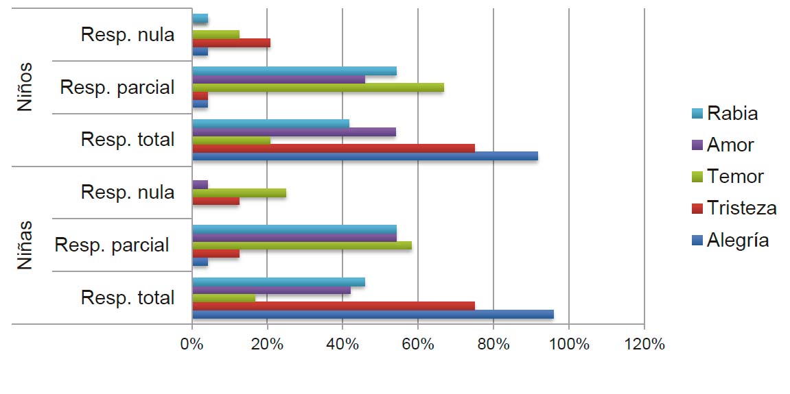 Con respecto a la respuesta parcial de reconocimiento de sentimientos, que no es la esperada, pero es aceptada, aumentaron las referidas a la rabia, del 55% al 66%; el temor, del 55% al 68%; la alegría, del 36% al 40%, y el amor, del 9% al 12%; mientras que la tristeza parcial disminuyó del 17% al 4%.