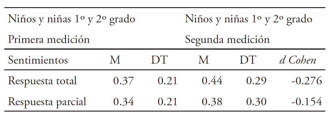 Tabla 1. Variación en el efecto de los sentimientos entre la primera y la segunda aplicación del instrumento en niños y niñas de los primeros grados