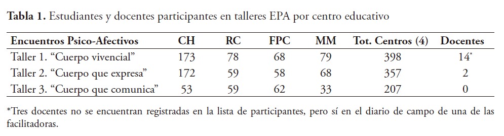Los talleres fueron realizados en cada una de las cuatro escuelas seleccionadas: CH, RC, FPC y MM. Hay que señalar que, del número esperado de docentes programado para que recibieran los talleres junto a su grupo de estudiantes, catorce (14) participaron de manera activa en el primer taller, “Cuerpo Vivencial”. Para el segundo taller, la cantidad se redujo drásticamente a dos (2) docentes y, en el tercer taller, ninguna maestra participó de manera activa, si bien algunas estuvieron físicamente presentes en las actividades que conformaban los talleres.