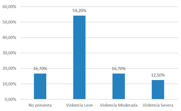 El 54.2% de las participantes presentó violencia psicológica leve, seguida por un 16.7% para las categorías Violencia Moderada y No presenta. Por último, un 12.5% de las participantes mostró violencia psicológica severa. Es decir, de alguna manera, el 83.3% presentó violencia psicológica. Por tanto, sería importante definir estas categorizaciones. En la figura 3, se grafican los tipos de abuso psicológico encontrados.