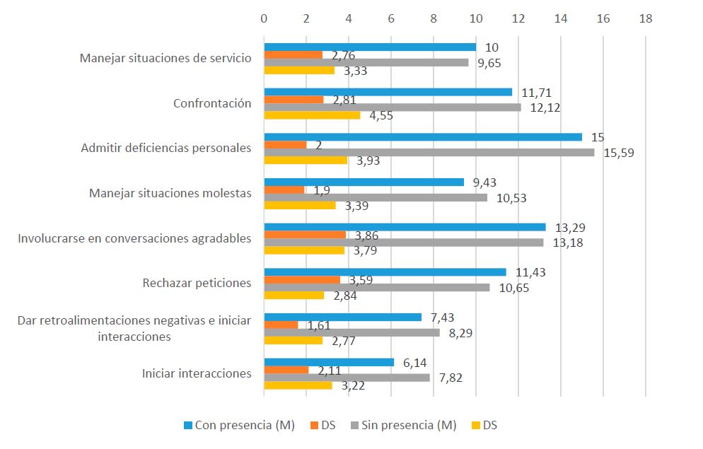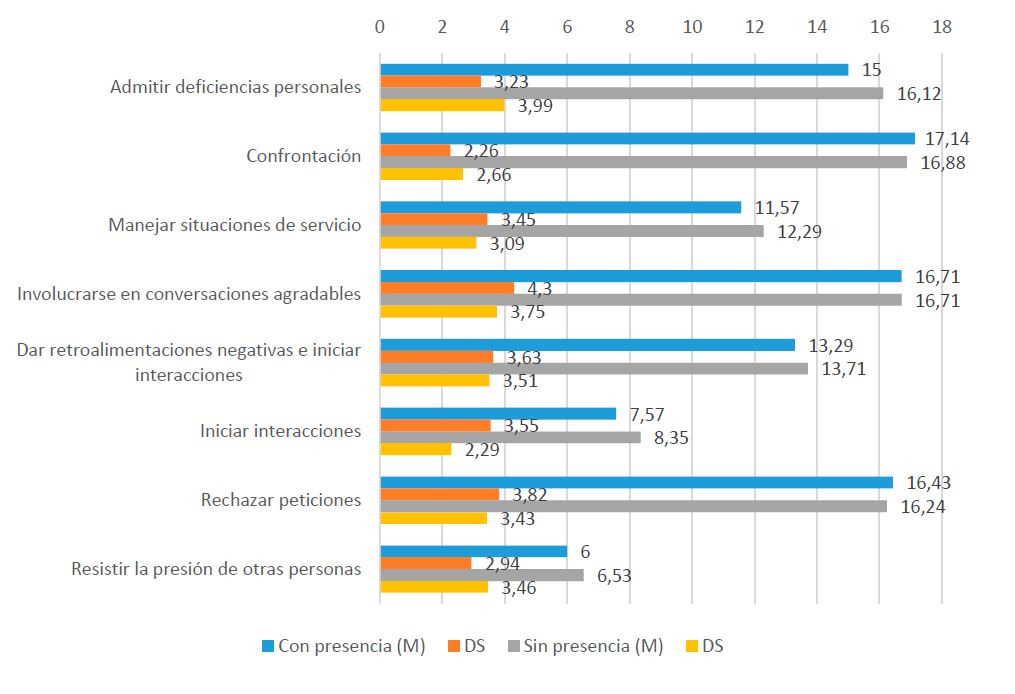 Los factores asertivos en la Escala de Malestar que presentaron las medias más altas, con y sin presencia de abuso psicológico, fueron Confrontación (M=11.71, DS=2.8 frente a M=12.12, DS=4.5), Admitir deficiencias (M=15.6, DS=2.000 frente a M= 15.6, DS=3.9), Involucrarse en conversaciones agradables (M=13.29, DS=3.861 frente a M=3.18, DS=3.8) y Rechazar peticiones, con una M=11.43 y una DS=3.599 ante la presencia de abuso, y una M= 10.65 DS=2.8 cuando no hay presencia de este.